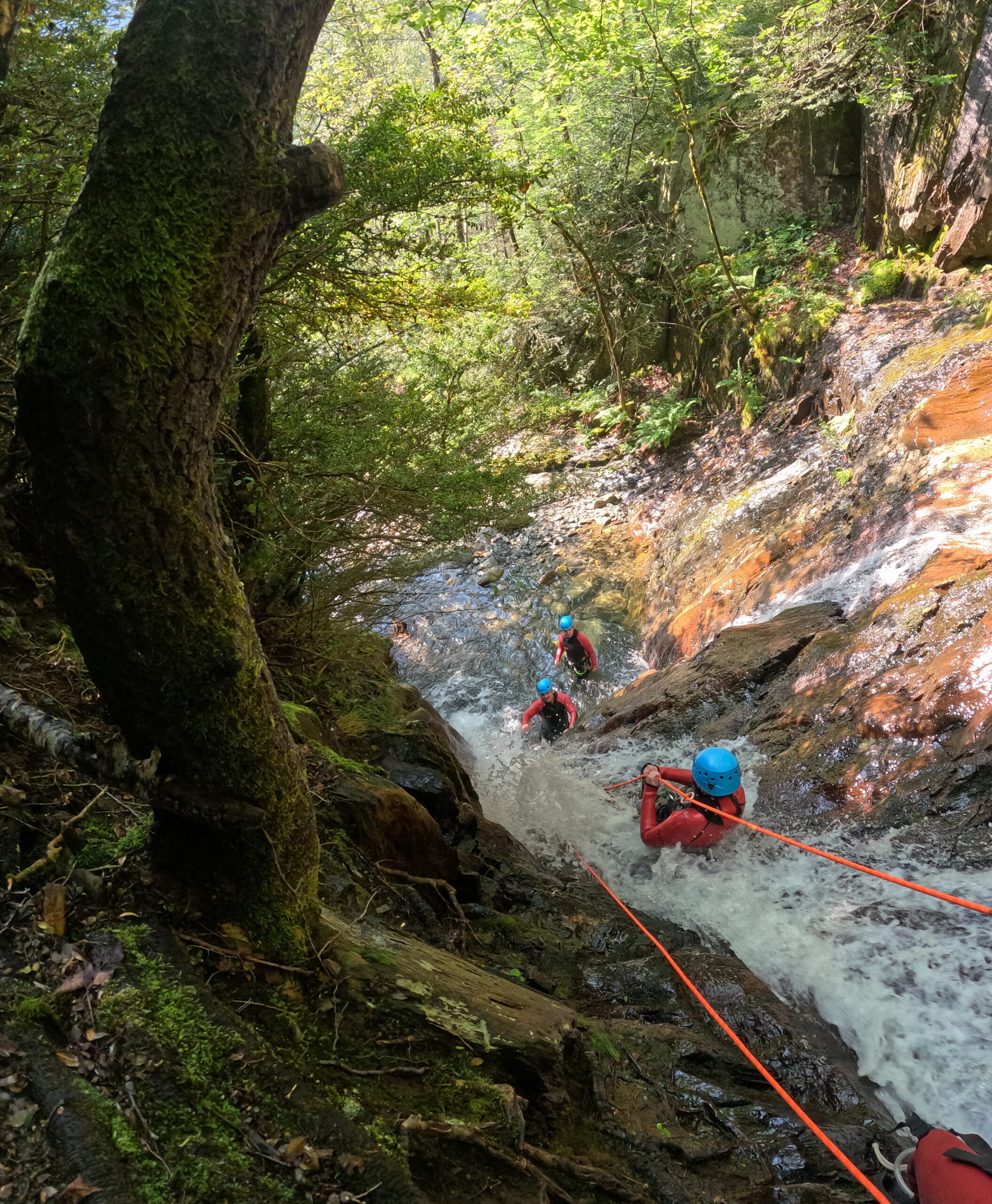 Passages rocheux, petits toboggans, rappels : chaque étape demande de communiquer, de s’organiser et de décider collectivement.